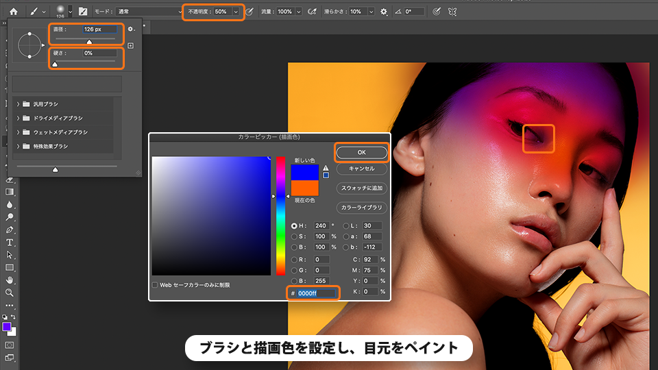 ブレンド条件を調整して、モデルの肌に直接ペイントしたかのような質感にします。