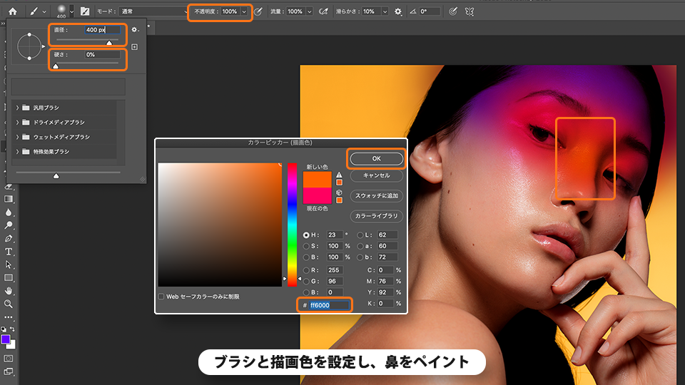 同様の手順で以下の通りにブラシと描画色を設定し、鼻をペイントします。