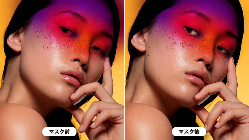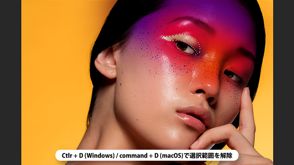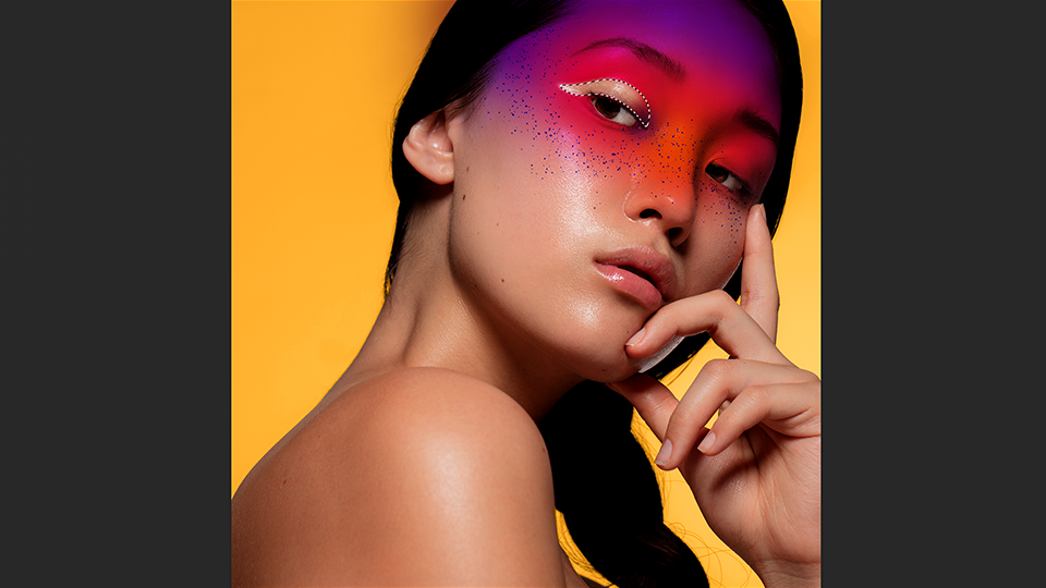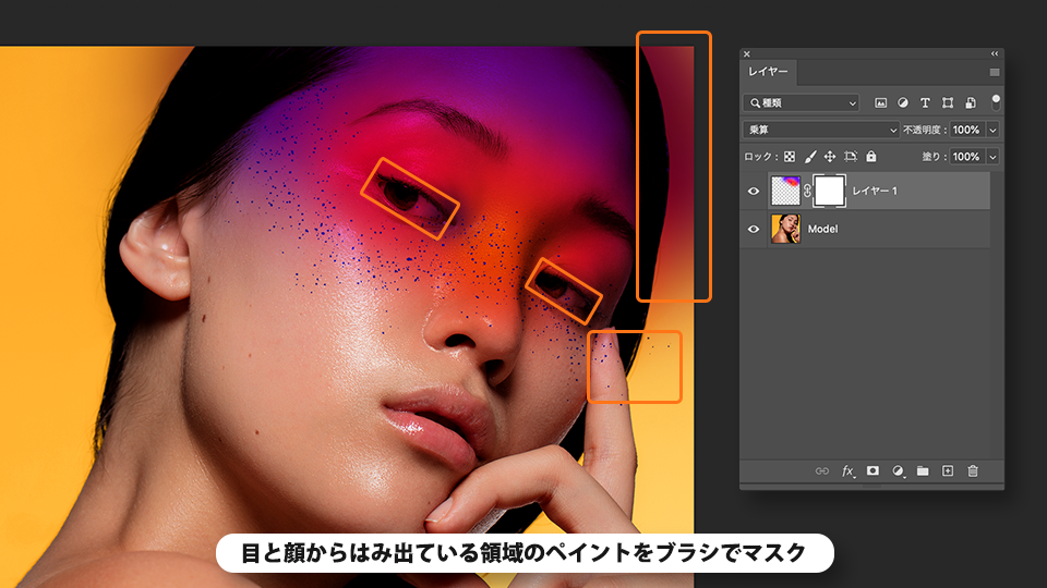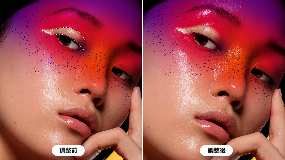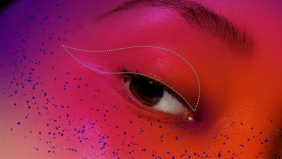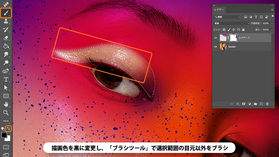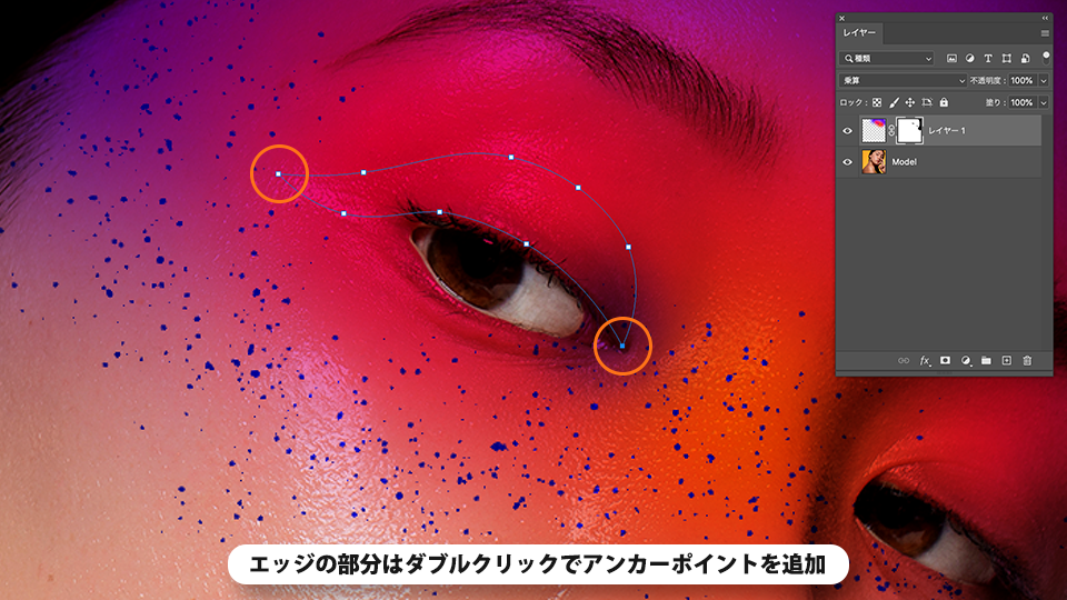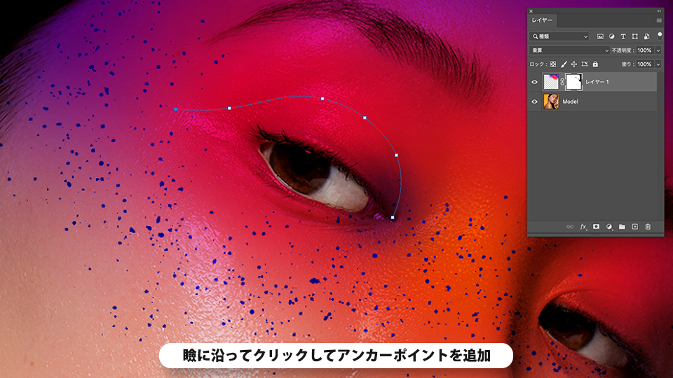 曲線ペンツールでモデルの瞼部分のペイントを切り抜き、デザインにアクセントを加えます。