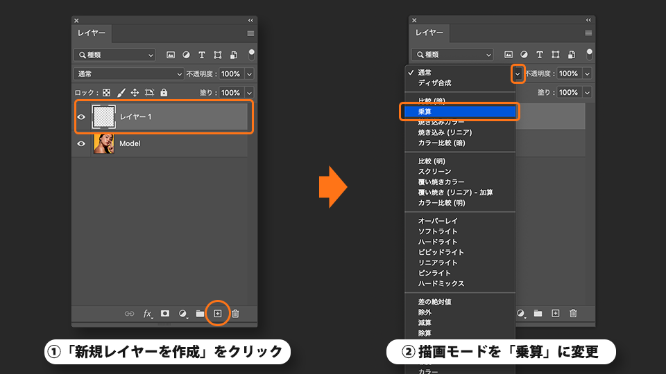 描画モードを「乗算」に変更します。