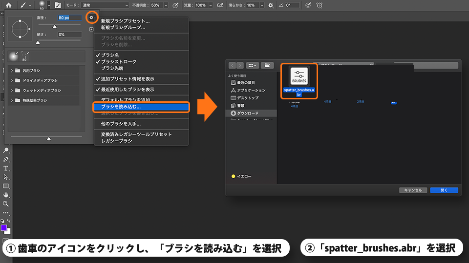 ダウンロードしたファイルから「spatter_brushes.abr」を選択して開きます。