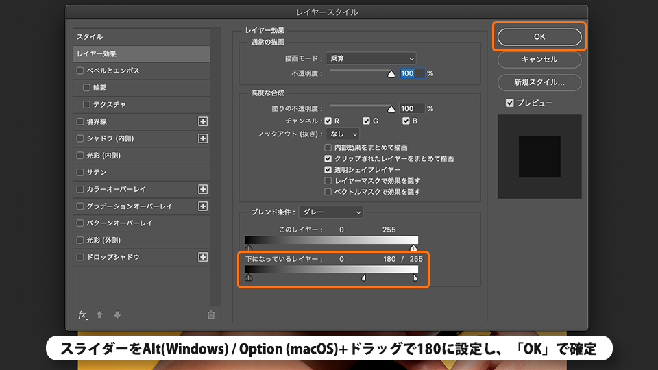 表示されたダイアログで、ブレンド条件の「下になっているレイヤー」の白いスライダーをAlt(Windows) / Option (macOS)+ドラッグで分割して「180」に設定し、「OK」をクリックで確定します。