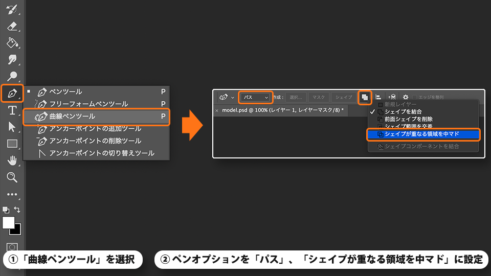 オプションバーでペンオプションを「パス」、「シェイプが重なる領域を中マド」に設定します。