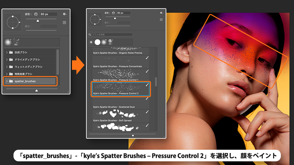 インポートされた「spatter_brushes」-「kyle’s Spatter Brushes –Pressure Control 2」を選択し、顔をペイントします。