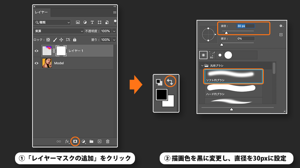 レイヤーパネル下部の「レイヤーマスクの追加」をクリックします。