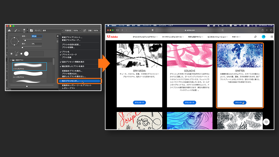 ブラシのダウンロードページ は、Photoshopのブラシのオプションメニューから直接開くことができます。