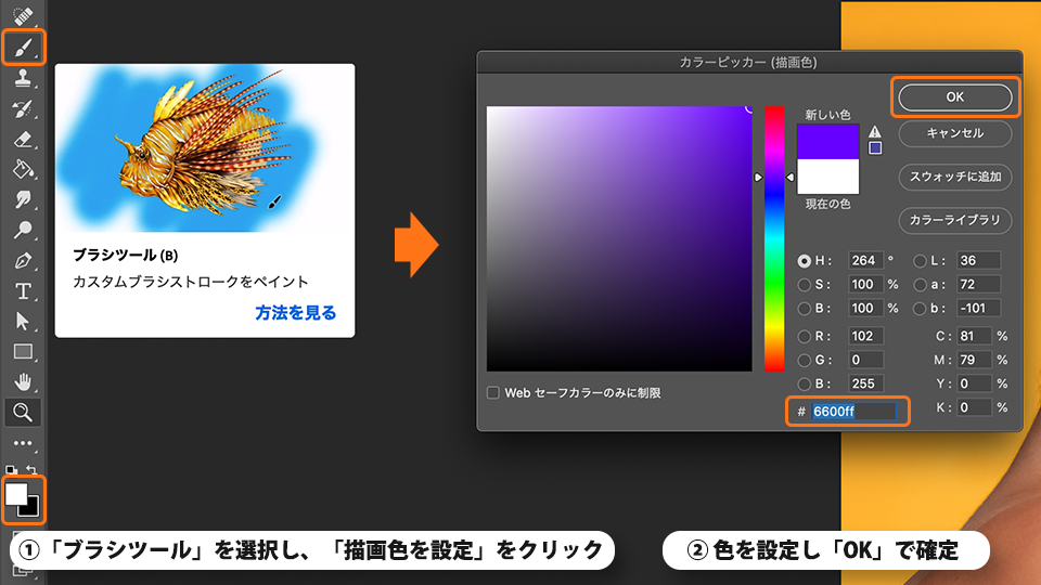 「描画色を設定」をクリックして色を紫「#6600ff」に設定し「OK」で確定します。