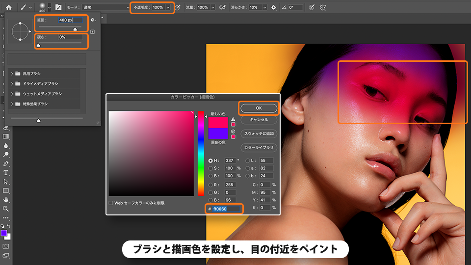 同様の手順で以下の通りにブラシと描画色を設定し、目元をペイントします。