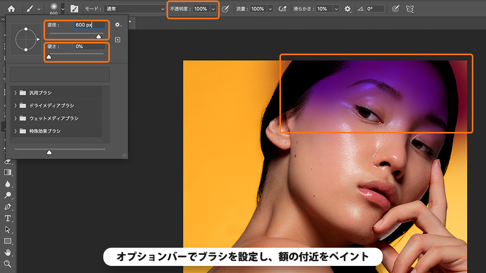 オプションバーでブラシを以下に設定し、顔上部をペイントします。
