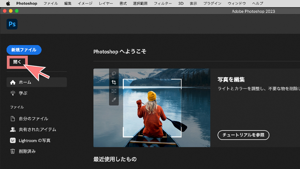 Photoshopを開いて、ダウンロードした写真を開くために「開く」をクリックします。
