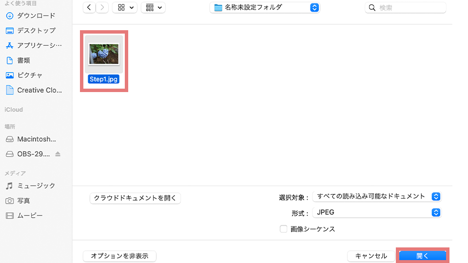 そして取り込みたい写真をクリックして選択し、「開く」をクリックするとPhotoshopに写真を取り込むことができます。