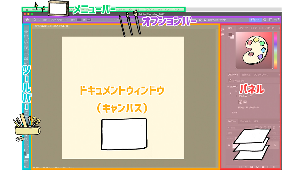 Photoshopの画面は大きく分けて5セクションあります。