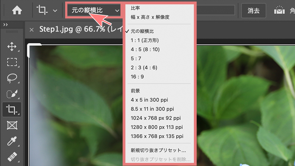 オプションバーでトリミングすることもできます。切り抜きツールをクリックしてから、元の縦横比をクリックすると、好きな比率を選ぶことができたり、サイズを選ぶこともできます。