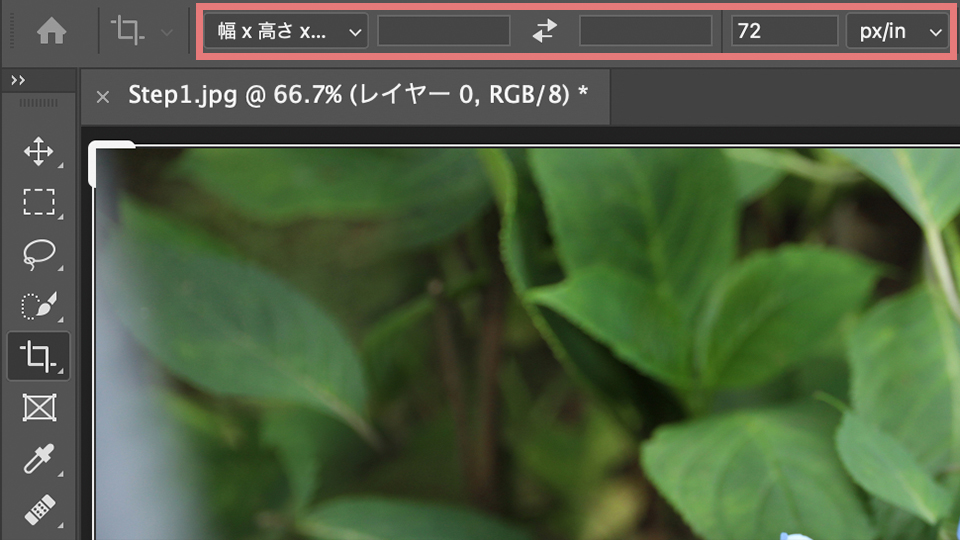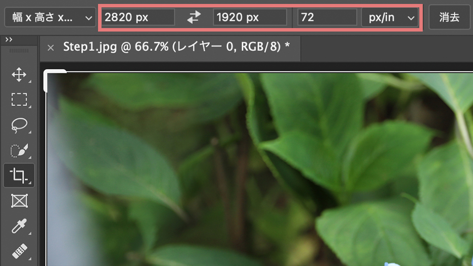 今回は、解像度は72px/in、幅と高さは2820px x1920pxにします。そして右上の丸をクリックすると、左下に2820px x1920px 72px/inと表示されてトリミングすることができます。