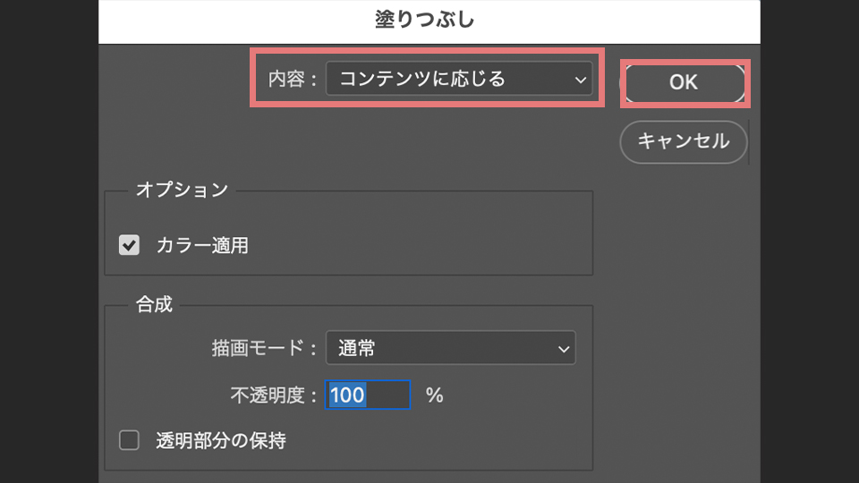 内容がコンテンツに応じるになっているのを確認してOKをクリックします。