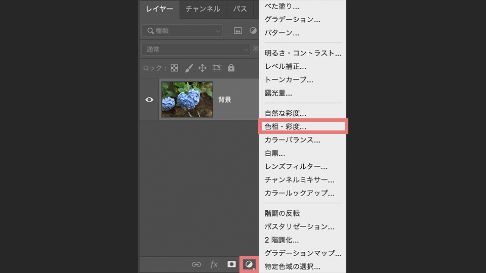 パネルの右下にある「塗りつぶしまたは調整レイヤーを新規作成」から「色相・彩度」をクリックします。