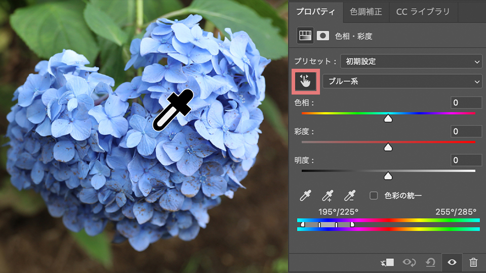 そしてまず、どこの色を変えたいかPhotoshopに伝える必要があるので、左上にある指マークをクリックして写真上で色を変えたいところをクリックします。