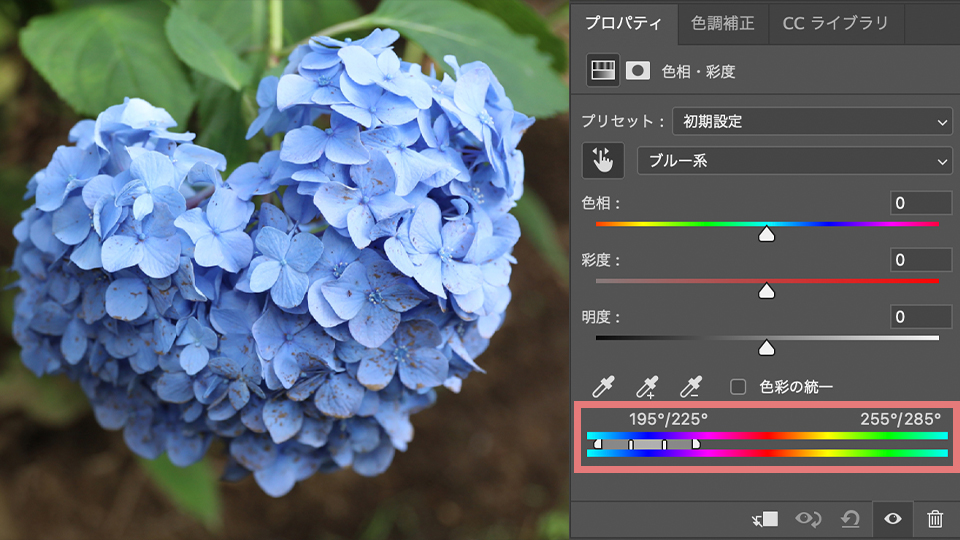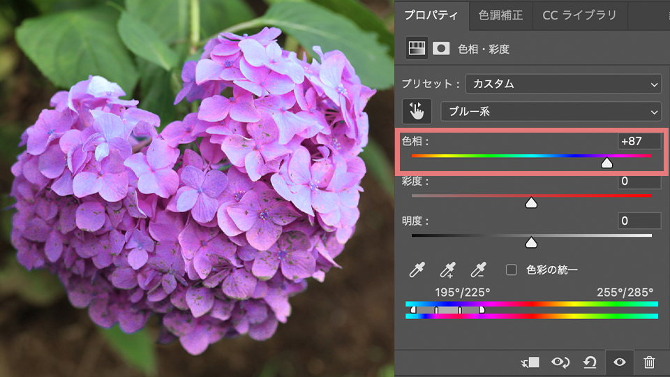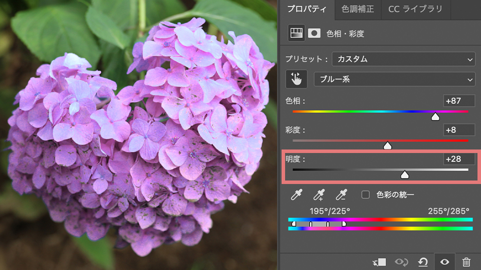 そして下に色相・彩度・明度があり、3つを使って変えたい色に調整することができます。