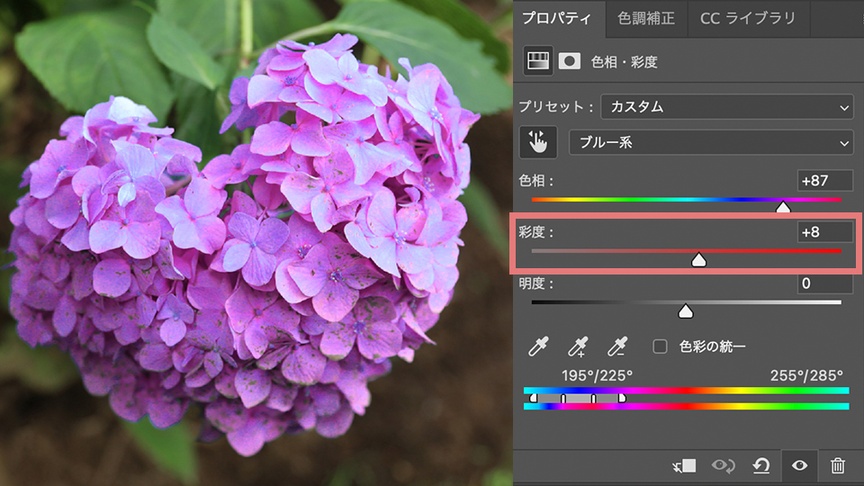 彩度のスライダーを動かすと、色の濃さを変えることができます。