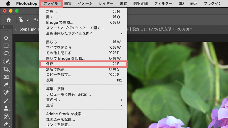 PSD形式での保存の仕方は、メニューバーにあるファイル>保存 をクリックします。