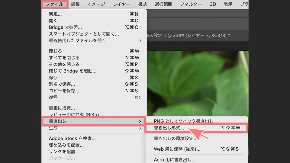 書き出しの仕方は、ファイル>書き出し>書き出し形式 をクリックします。