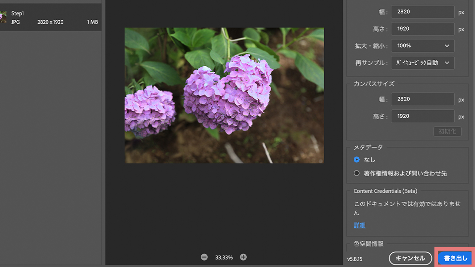 そして「書き出し」をクリックして、どこに書き出すかを決めて保存をクリックすると、JPGとして書き出すことができます。