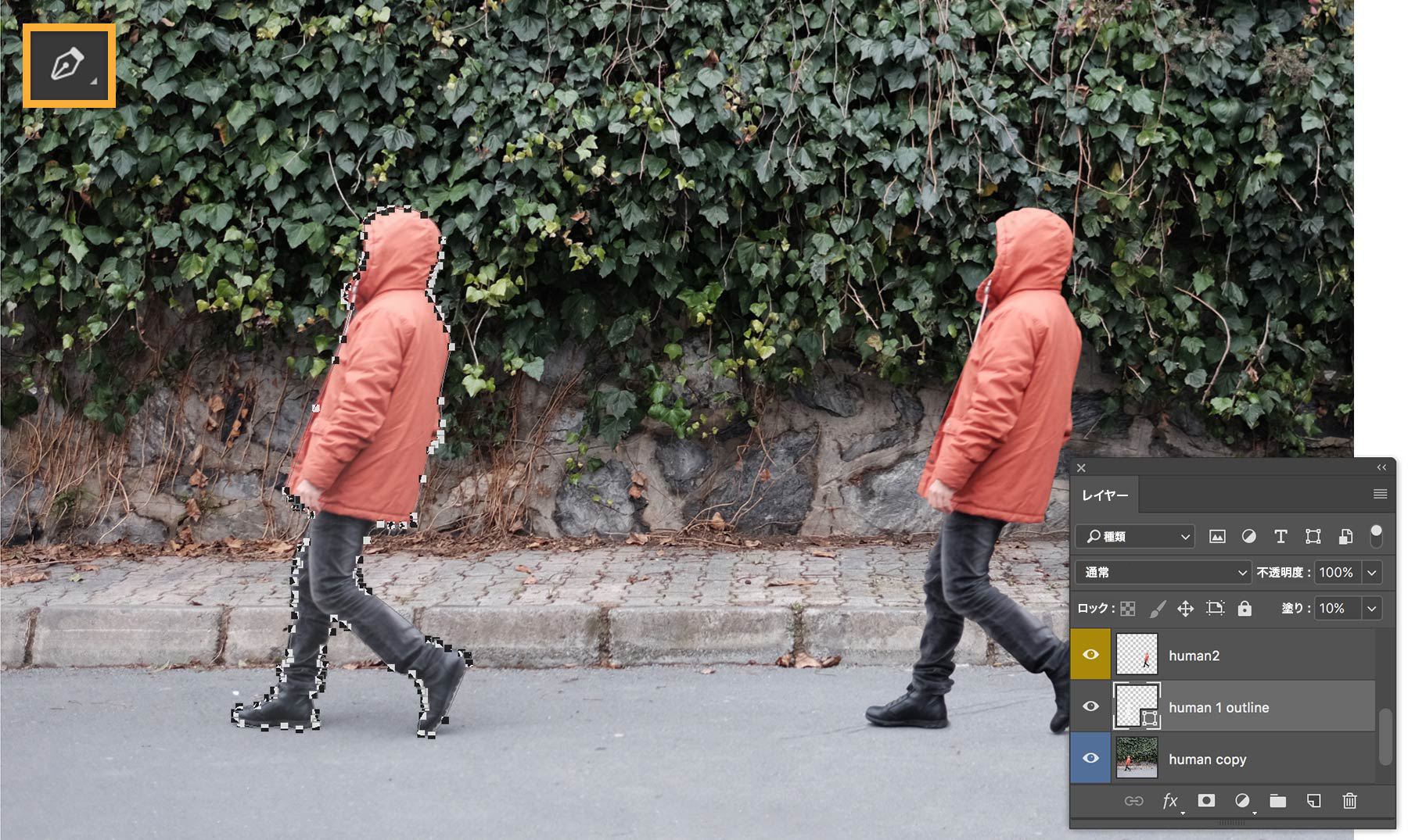 静止画が動くような効果を表現するには、まず元の写真から人物を複製します。ペンツールで人物をトレースし、パスパネル(「ウィンドウ/パス」)の「パスを選択範囲として読み込む」ボタンをクリックします。次に、選択範囲をコピー(「編集/コピー」)し、続けてペースト(「編集/ペースト」)して複製を作成します。移動ツールに持ち替えて、複製した画像をドラッグして元の位置の後方に配置します。