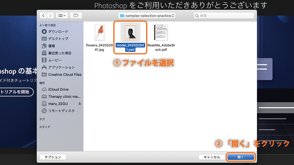 Photoshopを起動し、「ファイル」-「開く」で、サンプルファイル(model_342552941.psd)を開きます。