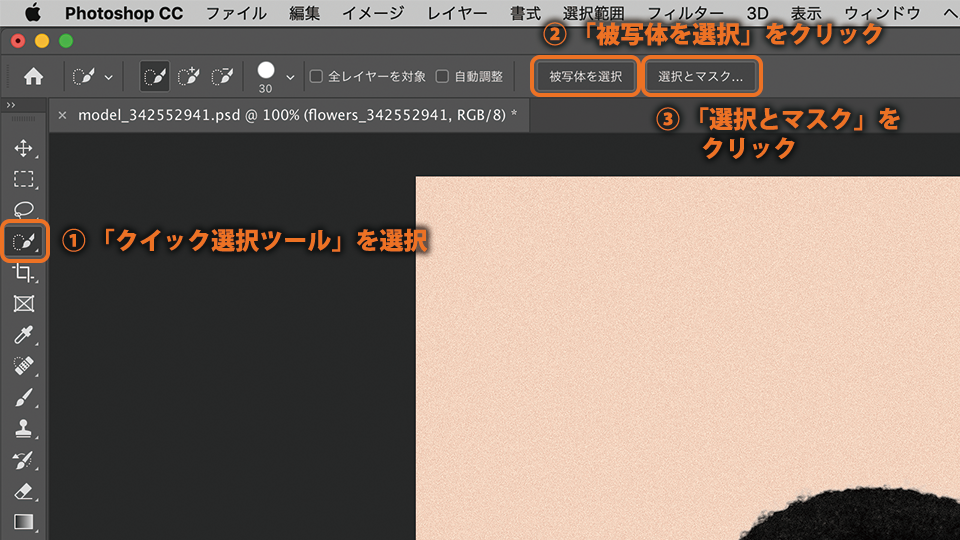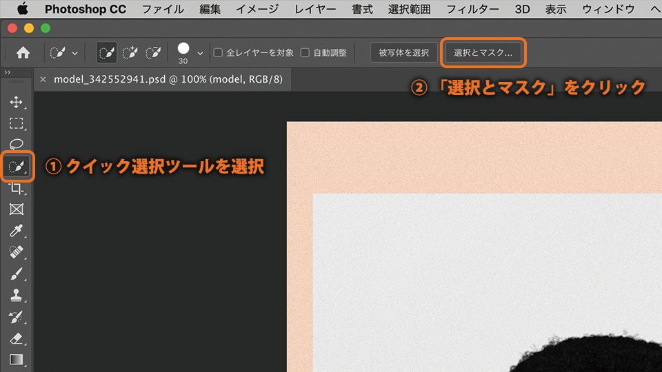 クイック選択ツールを選択し、オプションバーの「選択とマスク」をクリックします。