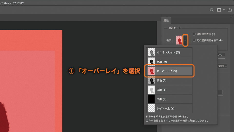 選択した領域の境界を確認するため、属性パネルの表示モードオプションで、表示を「オーバーレイ」にします。