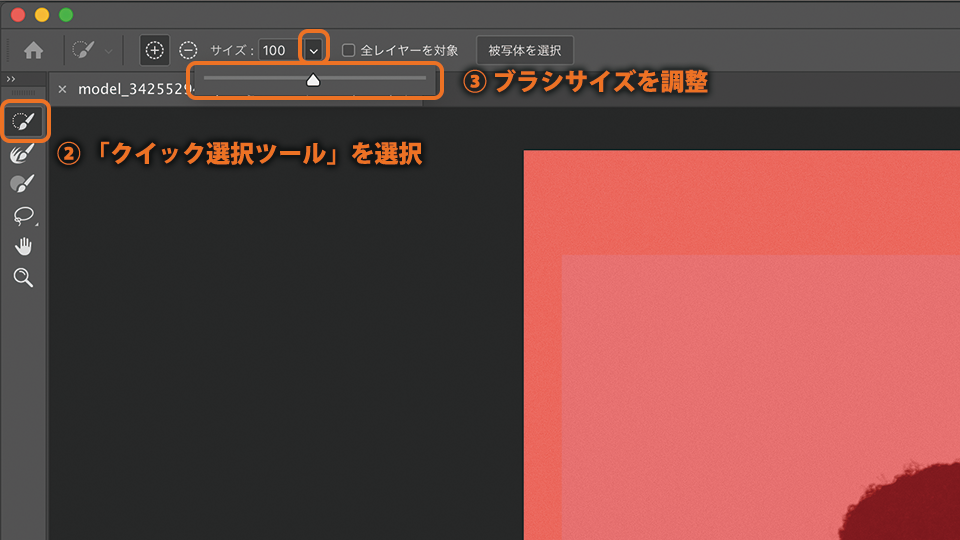 「クイック選択ツール」を選択し、ブラシサイズを調整します。