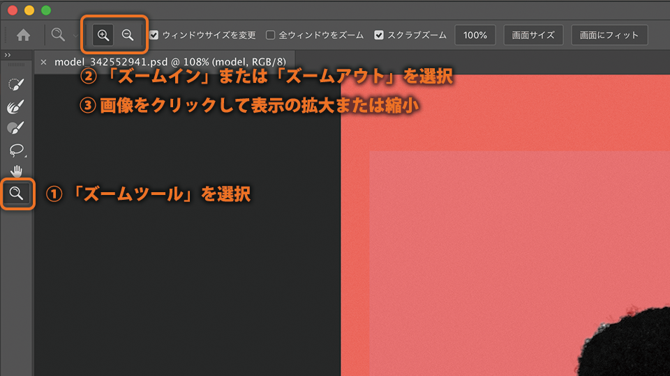 表示の拡大:オプションバーで「ズームイン」(プラスの虫眼鏡アイコン)を選択し、画像をクリック