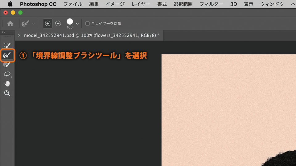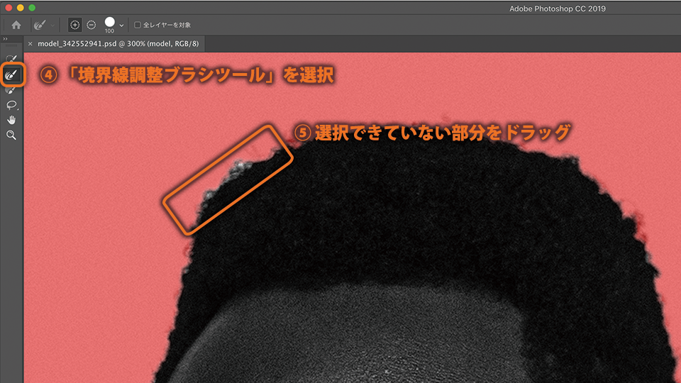 「境界線調整ブラシツール」は、髪の毛のような複雑な部分を選択するときに使用します。