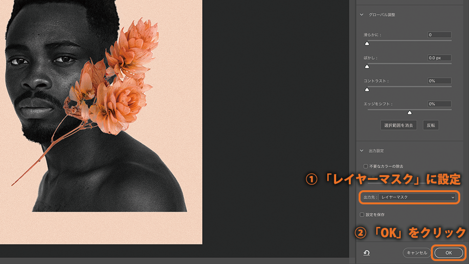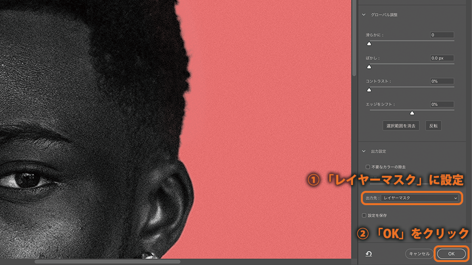 出力先を「レイヤーマスク」に設定します。