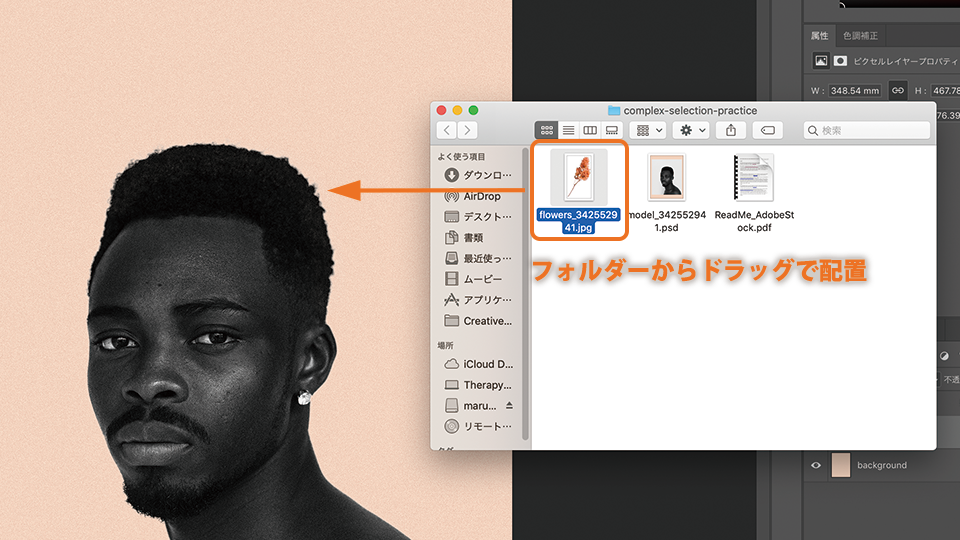 Photoshopドキュメントに、花の画像(flowers_342552941.jpg)をドラッグで配置します。