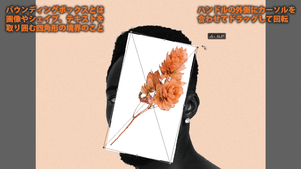 バウンディングボックスの周囲には白い正方形のハンドルが表示されます。ハンドルをドラッグすることで、サイズの変更、変形や回転がおこなえます。また、バウンディングボックスが表示された状態で、画像やシェイプ、テキストをドラッグして移動できます。