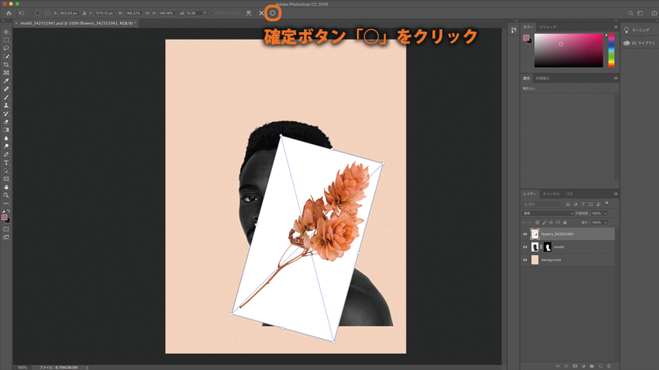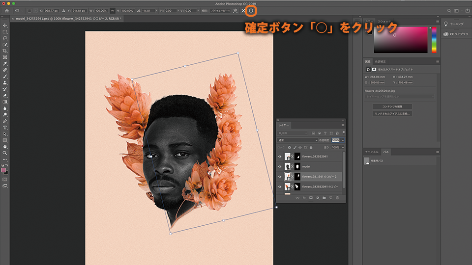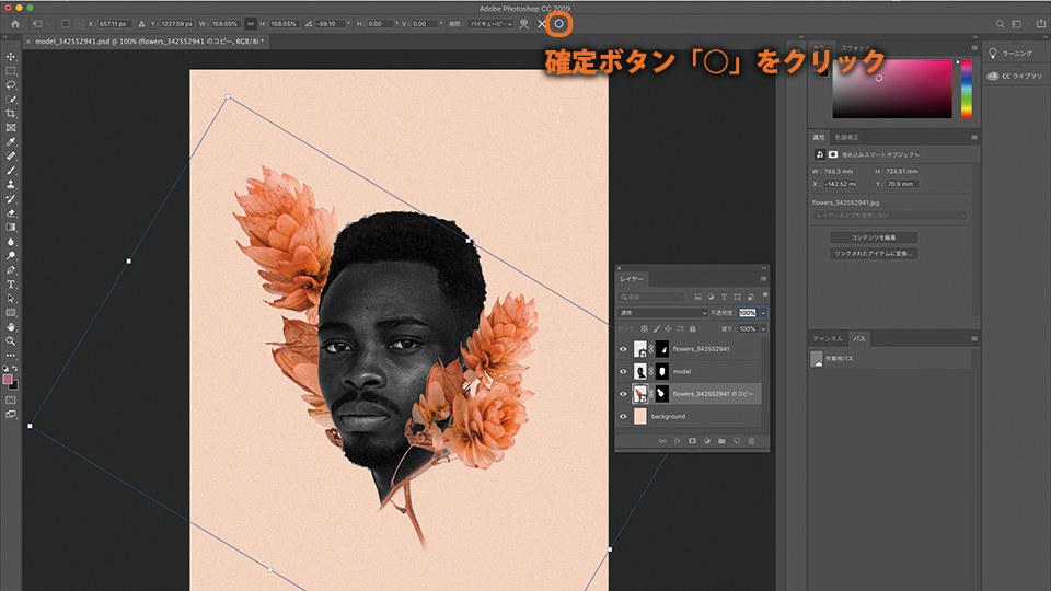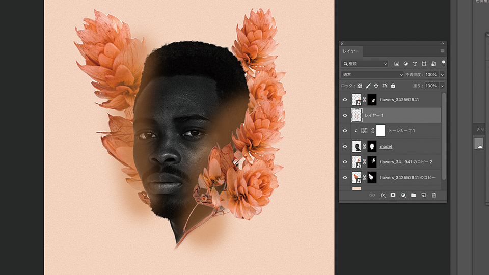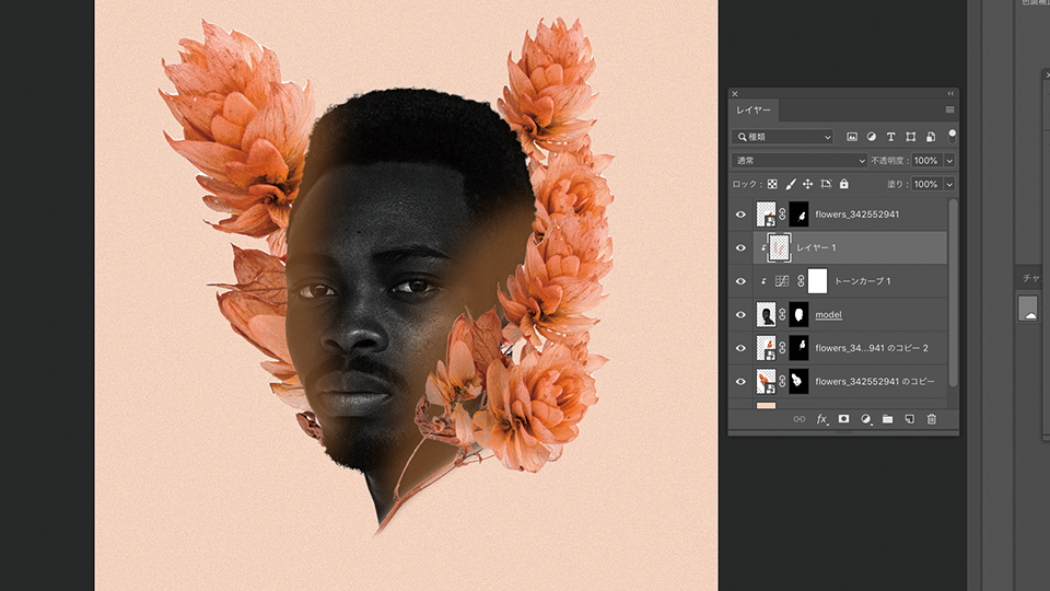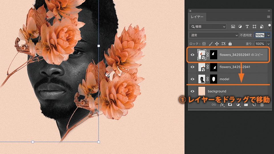 複製した花の画像のレイヤーをドラッグして、モデル(model)レイヤーの下に移動させます。