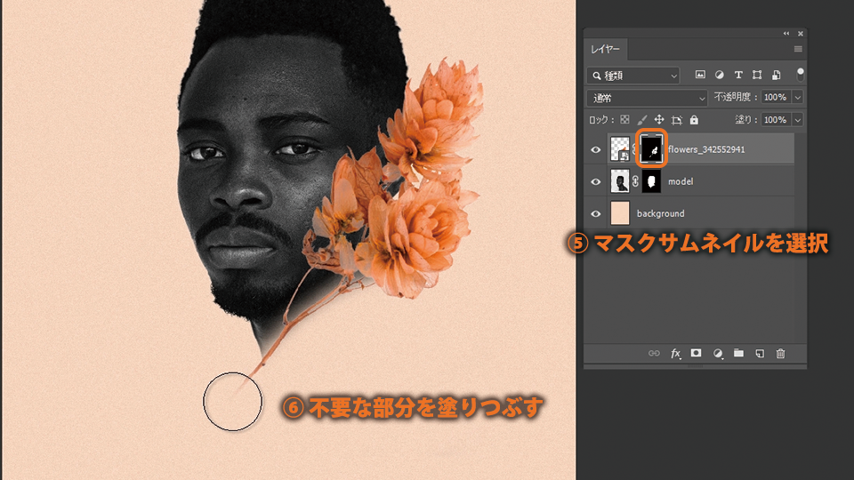 同様の操作で、花のマスクサムネイルを選択し、不要な部分を塗りつぶしていきます。