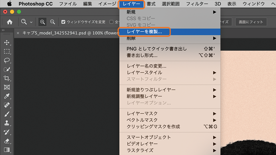 レイヤーパネルで、花の画像のレイヤー(flowers_342552941)が選択されていることを確認し、「レイヤー」-「レイヤーを複製」をクリックします。