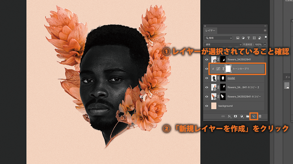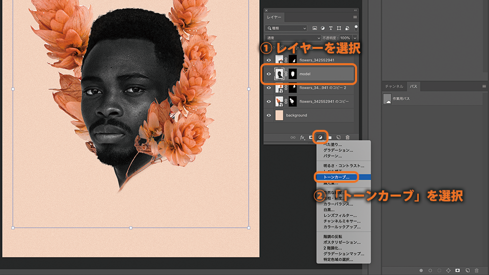 モデル(model)レイヤーを選択し、「塗りつぶしまたは調整レイヤーを新規作成」-「トーンカーブ」を選択します。トーンカーブとは、写真の色味や明暗を調整する際によく使われる機能です。