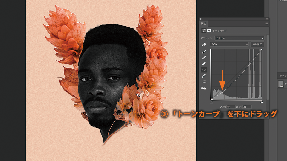 「属性」パネルのグラフの直線(トーンカーブ)の左下を下にドラッグして引き下げます。