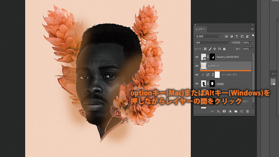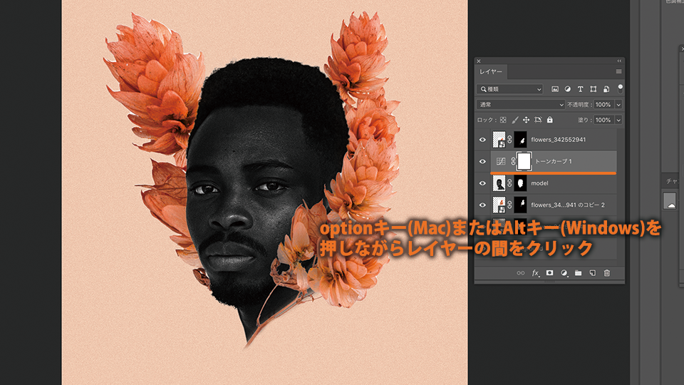 optionキー(Mac)またはAltキー(Windows)を押しながら、トーンカーブの調整レイヤーとモデル(model)レイヤーの間をクリックします。