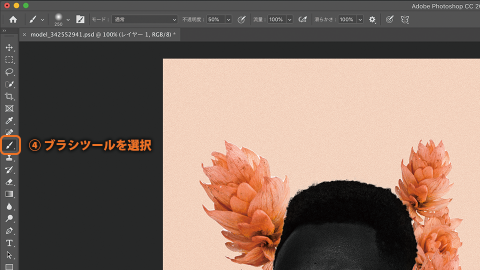 「ブラシツール」を選択し、オプションバーでブラシの設定をおこないます。