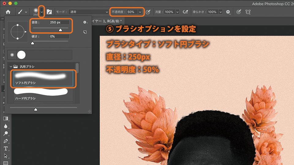 ブラシツールを選択して、オプションバーでブラシの設定をおこないます。