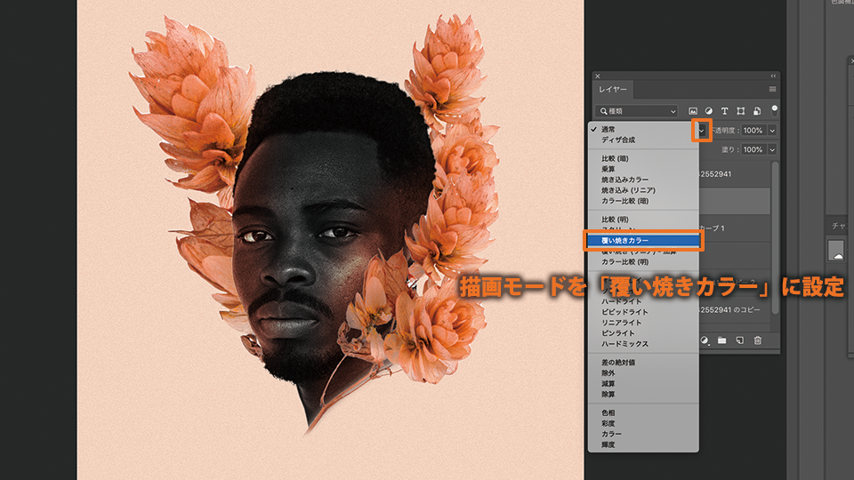 レイヤーの描画モードを「覆い焼きカラー」に設定します。