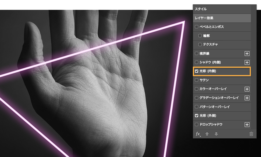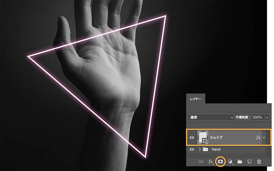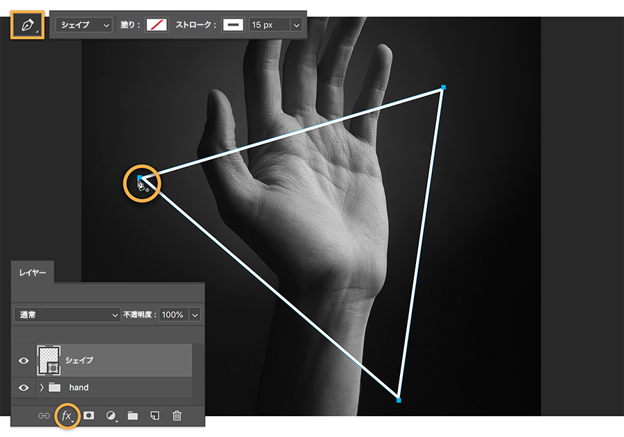 ペンツールを選択し、以下の画像を参考にオプションの設定をおこないます。3つのポイントをクリックして、手の周りに三角形を描画します。この例では三角形を描きましたが、どのようなシェイプを描いても構いません。新しいシェイプレイヤーを選択した状態で、レイヤーパネルからレイヤースタイルを追加アイコンをクリックして、「光彩(外側)」を選択します。