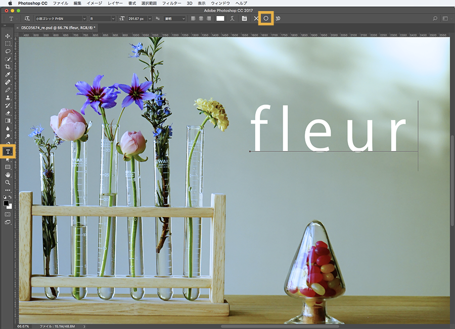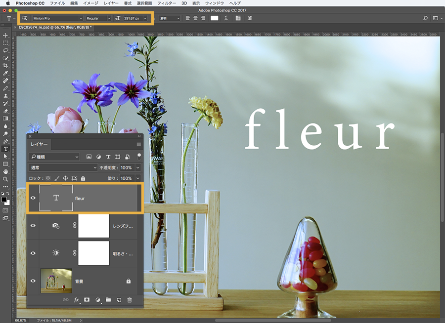 レイヤーパネル の テキストレイヤー をクリックして選択し、 オプションバー からフォントの種類と文字の大きさを変更します。好みのフォントがない場合はTypekit から探してみましょう。