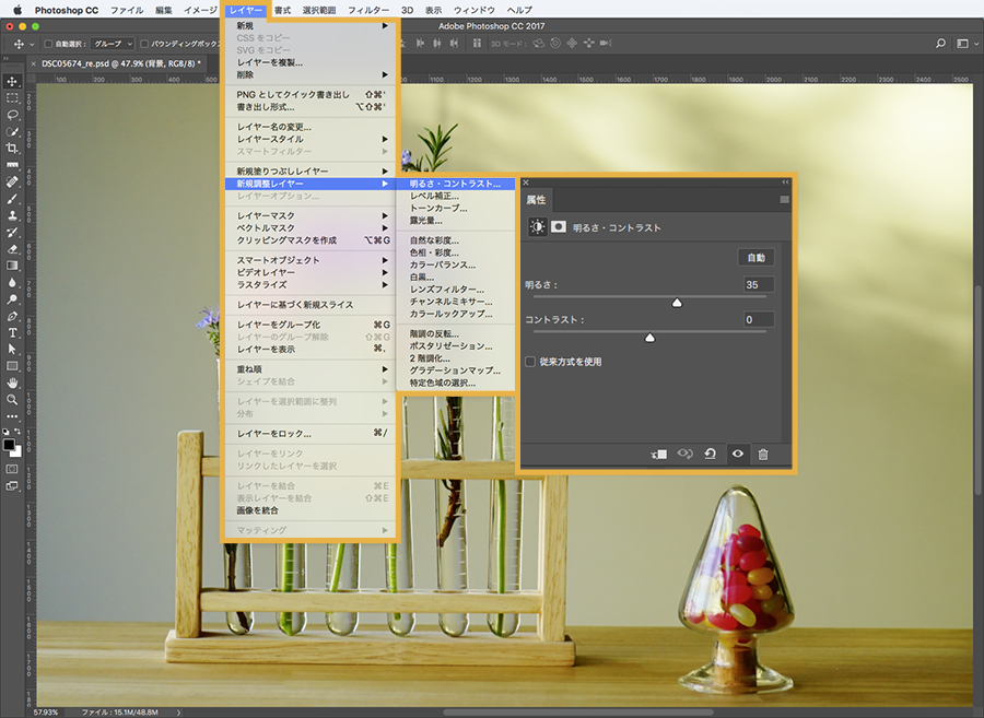 アプリケーションメニューの「 レイヤー/新規調整レイヤー/明るさ・コントラスト 」を選択し、明るさとコントラストのバーを左右に動かして好みの明るさに変更します。