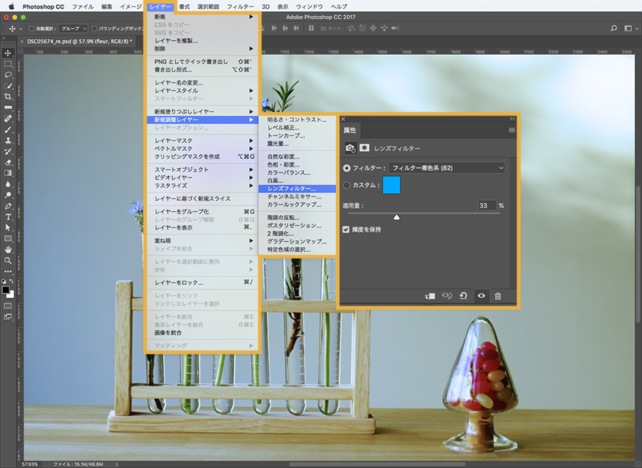 アプリケーションメニューの「 レイヤー/新規調整レイヤー/レンズフィルター 」を選択します。この「 レンズフィルター 」を使うことで、あらかじめ用意された色調に整えることができます。今回はさわやかな雰囲気にしたいので、フィルターを「 フィルター寒色系(82) 」に変更し、適用量を調節します。