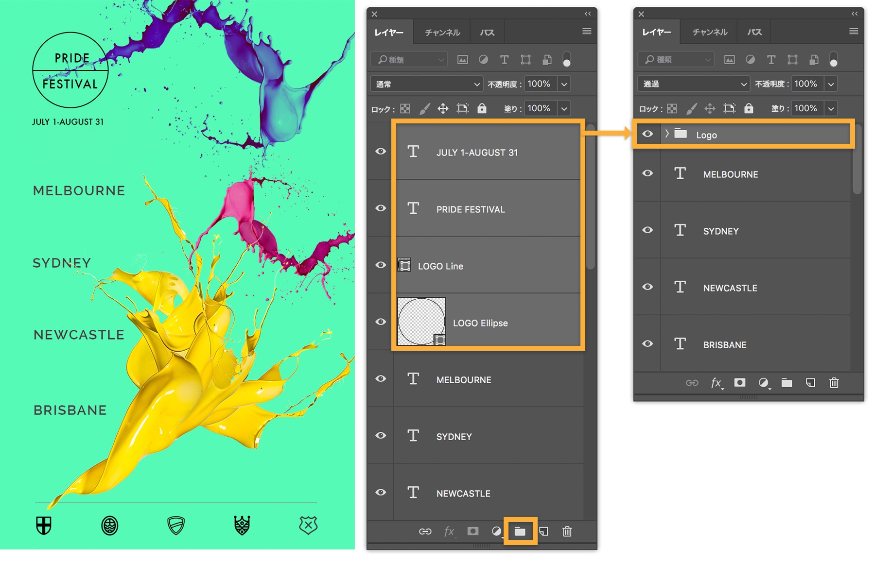 文字レイヤー「JULY 1-AUGUST 31」をクリックします。次に、Shiftキーを押しながら「LOGO Ellipse」レイヤーをクリックして、「PRIDE FESTIVAL」と「LOGO Line」を含む、ロゴを形成する4つのレイヤーをすべて選択します。レイヤーパネルの下部にある新規グループを作成アイコンをクリックし、新しいグループ名をダブルクリックして「 Logo 」に変更します。「Logo」レイヤーグループの横にある矢印をクリックして開くと、そのグループに整理されたレイヤーが表示されます。